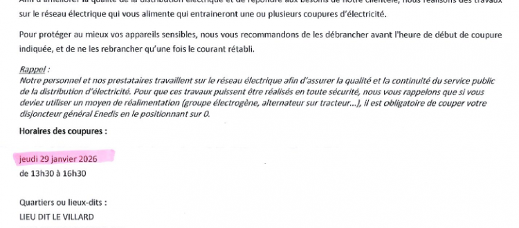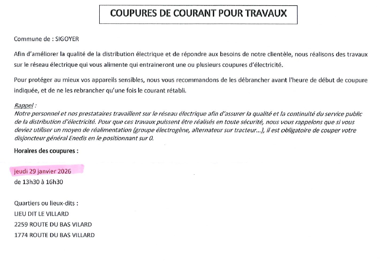 27 Jan COUPURE DE COURANT POUR TRAVAUX JEUDI 29 JANVIER 0 Commentadminsigo05Actualités 20260127083542773Télécharger